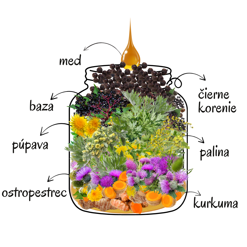 BIO med, Baza čierna (Sambucus nigra) 100 % bio šťáva z plodu, Kurkumovník dlhý (Curcuma longa) sušený prášok, Pestrec mariánsky (Silybum marianum) extrakt z pupeňov, Púpava lekárska (Taraxacum officinale) extrakt z koreňa, Piepor čierny (Piper nigrum) sušený prášok, extrakty z listov: 1. Palina ročná (Artemisia annua), 2. Palina dračia (Artemisia dracunculus), 3. Palina pravá (Artemisia absinthium).