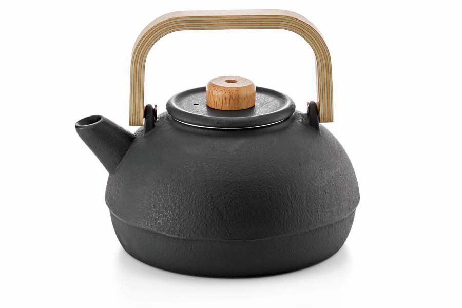 Liatinový čajník s nerezovým sitkom a s drevenou rúčkou v čiernom prevedení.
