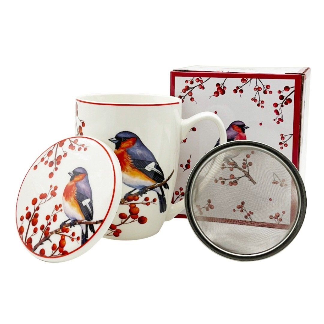 Bylinkový hrnček s vrchnákom a nerezovým sitkom s jedinečným motívom nádherneho hýľa s plodmi jarabiny roztrúsenými po okrajoch v sýtych odtieňoch červenej.