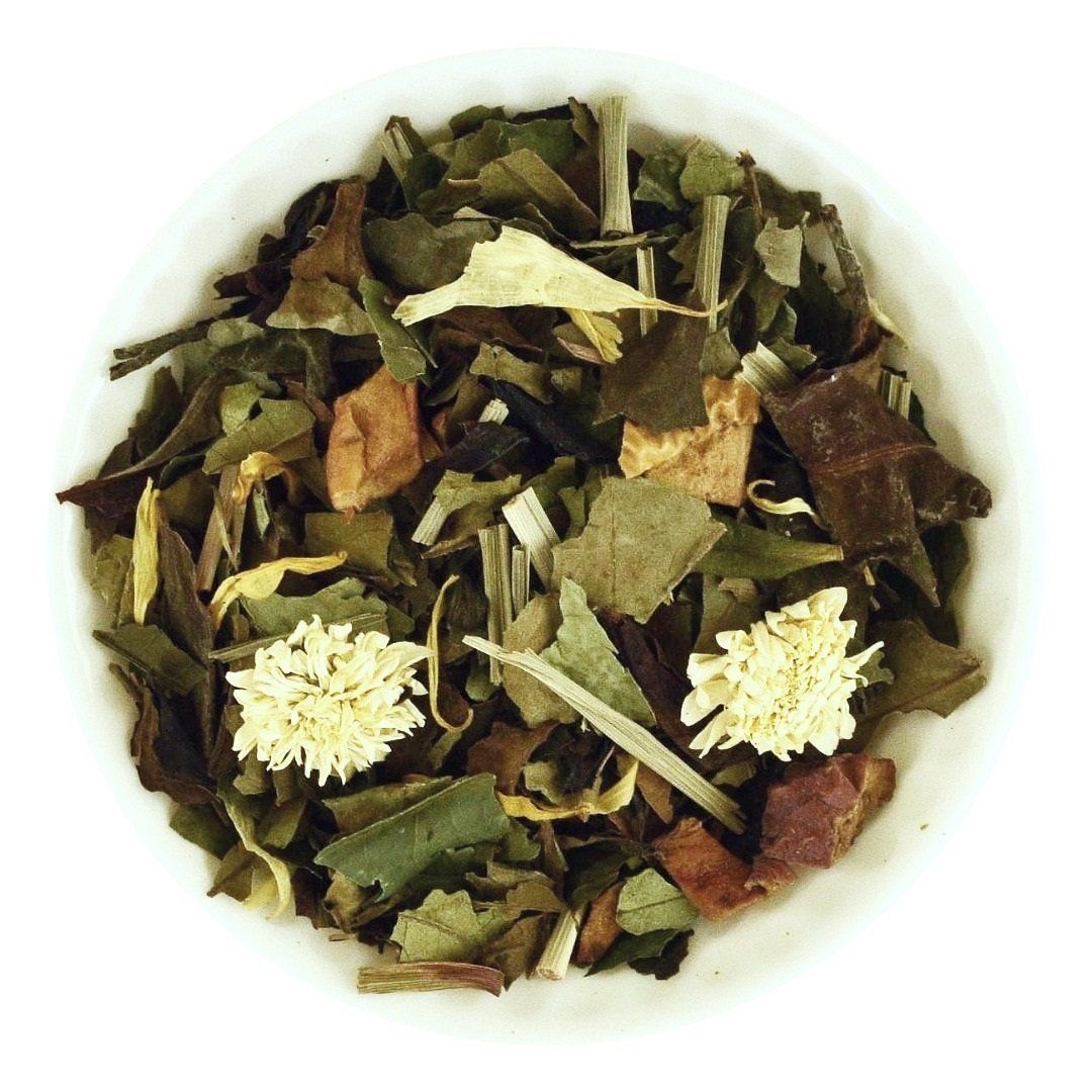 Zloženie: biely čaj (55 %), citrónová tráva, kúsky jabĺk, černica list, prírodná aróma, kvety nechtíka, kvety rumančeka